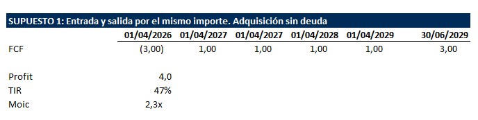 En el primero, la operación se financia íntegramente con equity. El inversor aporta 3 millones, el negocio genera 1 millón anual de flujo de caja libre y al final del periodo recupera los 3 millones de la venta. El resultado es un profit de 4 millones, una TIR del 47% y un MOIC de 2,3x.