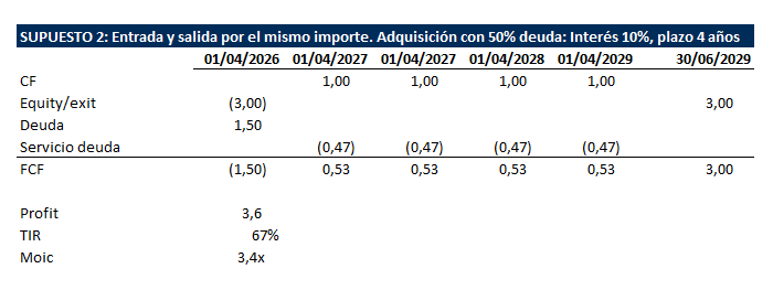 En el segundo, la operación se estructura con 1,5 millones de equity y 1,5 millones de deuda al 10% a cuatro años en cuota constante. El servicio anual de la deuda es de 473.000 euros, lo que deja un flujo de caja disponible para el equity de 527.000 euros cada año. Al vencimiento, el inversor recupera igualmente los 3 millones de la venta. El resultado es un profit de 3,6 millones sobre 1,5 millones invertidos, una TIR del 67% y un MOIC de 3,4x.